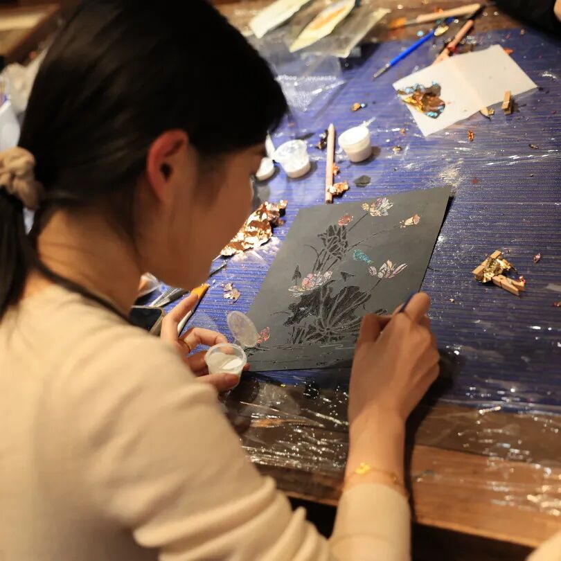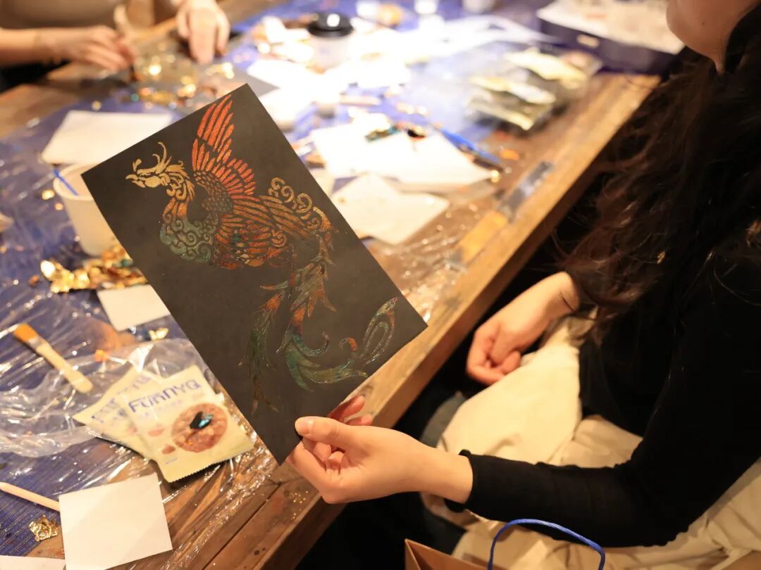 在民俗艺术中心展馆内,大家共同揭开非物质文化遗产“烧箔华彩”的神秘面纱,体验传承与创新的金属魔法。在非遗传承人的指导下,女职工们依次完成“师授古艺、工选图样、炉烧华彩、匠心定型”等步骤。从聆听老师的讲解,到精心挑选图案,再到亲手绘画、烧箔、定型,每一步都凝聚着匠心与专注。最终,每位参与者都收获了独一无二的华彩成品,于指尖传承非遗之美,于心中镌刻匠心之韵。