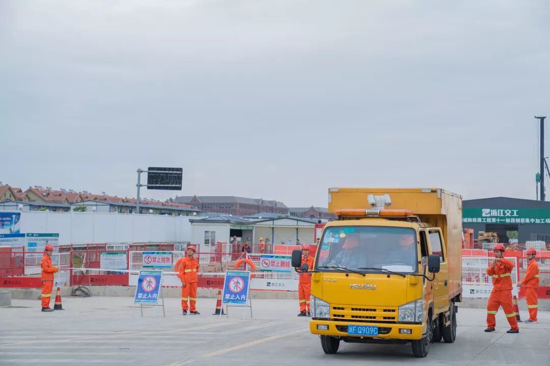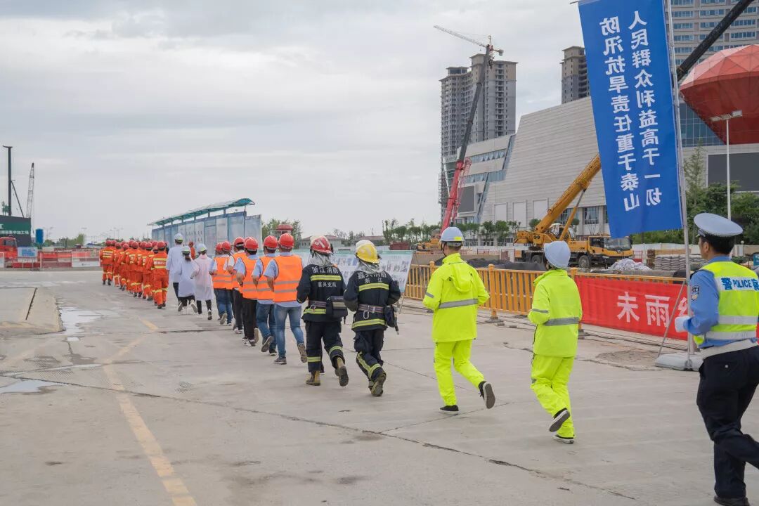 在杭海城际铁路第11标段浙大国际学院站施工现场,嘉兴各县(市、区)应急局、水利局、海宁市各镇(街道)防汛工作的相关负责人以及各参演单位成员近三百人进行了应急演练现场观摩。杭海城际铁路项目11标、13标参与演练。